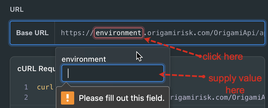 When you see {environment} that’s your cue to manually specify which environment you want to target with your API calls. You can choose any valid environment, depending on your integration needs. This variable isn’t automatically resolved, so be sure to replace {environment} with the appropriate value before making requests.